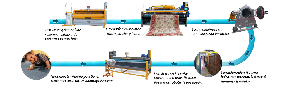 Fabrikamızda yıkanacak halılar dokuma özellikleri, cins ve niteliklerine göre sınıflandırılır. Sonra aşağıdaki aşamalardan geçirilerek her türlü mikro organizmadan arındırılıp steril hale getirilir.